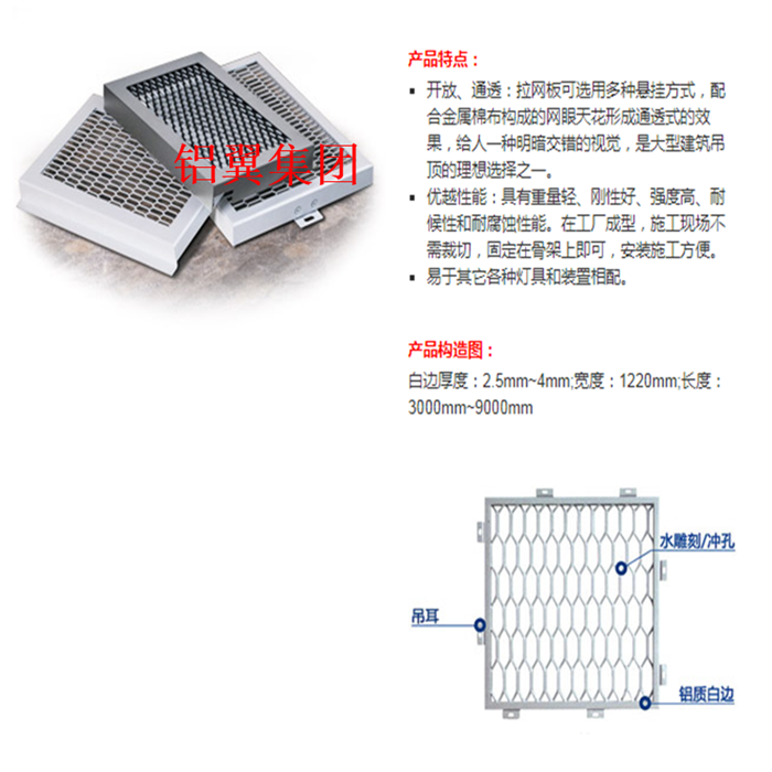 專業生產鋁拉網板、鋁板網、玻璃棉氈鋁板網吸聲墻面、鋁板沖孔網廠家,經驗豐富,按圖均可定制。 鋁網板、沖孔鋁板、拉網天花、鋁拉網幕墻、拉伸鋁網、鋁拉網吊頂、幕墻鋁板網等,款式齊全,按圖定制生產。沖孔網鋁板定制孔型:長孔、圓孔、方孔、三角孔、魚鱗孔、橋式孔、菱形孔、五角孔、六角孔、八孔、十字孔、指甲孔、梅花孔、人字孔、及其它異形孔。鋁翼集團集研發、設計、生產、定制及銷售服務為一體的大型拉網鋁單板生產廠家,注冊資金3180萬元,工廠總占地面積約30萬平方,真正的實力廠家,接大單急單有優勢。 實力廠家更值得信賴,源頭工廠直銷價格更優惠,歡迎詢價,歡迎蒞臨公司注冊地實地考察!